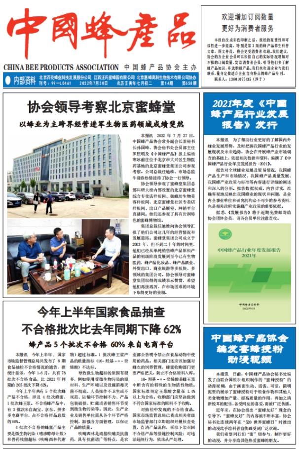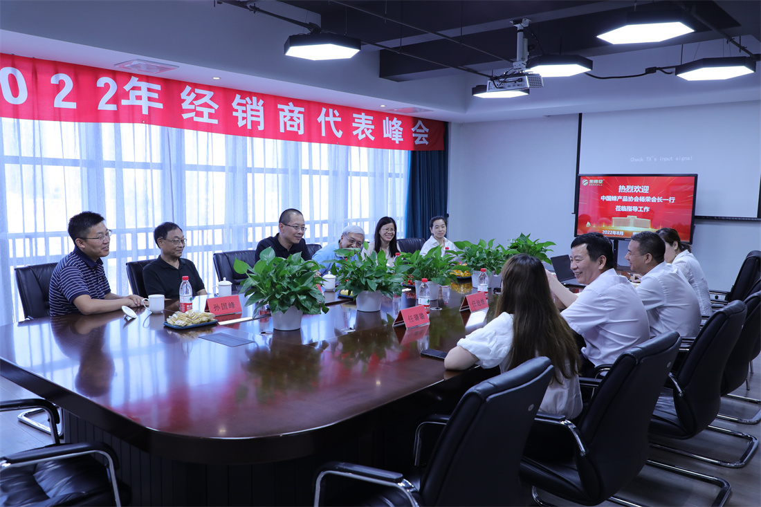 2022 年 7 月 27 日,中國蜂產(chǎn)品協(xié)會常務(wù)副會長兼秘書長孫國峰、協(xié)會秘書處會員部主任羅照明及《中國蜂產(chǎn)品》報主編楊寒冰蒞臨北京蜜蜂堂集團(tuán)公司參觀考察,公司總裁任迪維、市場總監(jiān)牛逢春熱情接待并講解。 -