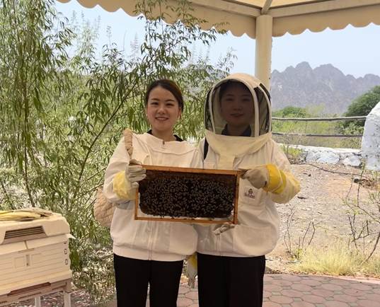 蜂產(chǎn)業(yè)被譽(yù)為“空中農(nóng)業(yè)”和“健康產(chǎn)業(yè)”, 集經(jīng)濟(jì)、社會(huì)和生態(tài)效益于一體,是現(xiàn)代農(nóng)業(yè)的重要組成部分。蜜蜂僅利用自然界中的百花資源,便可獲得蜂蜜、蜂王漿、蜂膠等10多種蜂產(chǎn)品,既是良好的保健醫(yī)療食品,還是重要的工業(yè)原料;同時(shí),蜜蜂授粉可以顯著提高農(nóng)作物產(chǎn)量和效益,保障糧食安全。中國作為養(yǎng)蜂大國和蜂產(chǎn)品出口大國,蜜蜂堂作為中國蜂產(chǎn)品行業(yè)龍頭企業(yè),在這次的行程中也有幸受邀參加迪拜的蜜蜂養(yǎng)殖基地。走進(jìn)蜂場,看著一排排整齊、造型精致的現(xiàn)代蜂箱,深入了解他們的養(yǎng)蜂方式方法,蜜蜂堂集團(tuán)副總?cè)舞磋醇巴赓Q(mào)部銷售經(jīng)理都很受啟發(fā)。