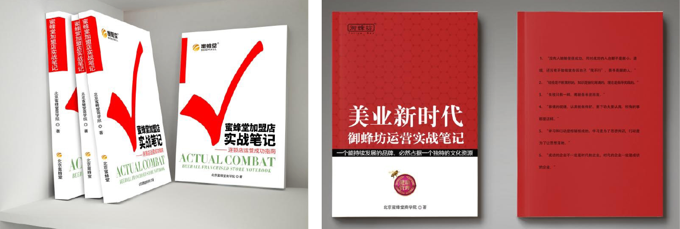 蜜蜂堂商學(xué)院自成立以來,憑借從廠家、經(jīng)銷商和門店運(yùn)營收獲的實戰(zhàn)歷練,總結(jié)出一套豐富、實用、有效的經(jīng)驗方法,并練就敏銳的市場洞察力,準(zhǔn)確切分市場,并將這套經(jīng)驗方法整理成冊《蜜蜂堂加盟店實戰(zhàn)筆記》及《美業(yè)新時代·御蜂坊運(yùn)營實戰(zhàn)筆記》。
